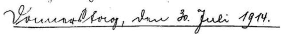 Hause, wo ich alles beim alten finde. Man denkt der Kriegsrummel gehe vorüber, wie all die Jahre vorher, wo es sich um Marokko, und um Balkankrisen handelte. Auf meine Mitteilung daß mich auch eine Mobilmachung, zufolge meiner Designation, noch längere Zeit in der Vaterstadt läßt, wich auch die letzte Beunruhigung, denn es konnte ja nicht plötzlich kommen, daß ich fort war ohne mich verabschieden zu können. Auf den Straßen herrschte, ein reges Leben mußten doch die zahlreichen in Dresden wohnhaften Österreicher, dem Rufe ihres Vaterlandes zur Fahne folgen.