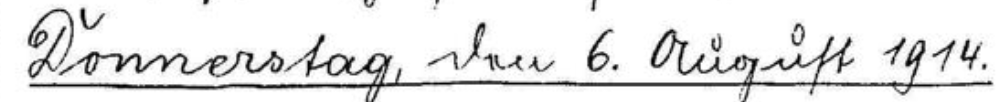 ich nicht zu Mittag kommen konnte, machte ich mich auf den Weg zur Kaserne. Trotzdem wir jetzt 2 Mann waren (Gren. der Reserve Burger teilte sich jetzt mit mir in die Arbeit) hatten wir vollauf zu tun, um all die Listen ufm. anzufertigen. In der Mittagstunde verabschiedete ich mich von Feldwebel Leuschel und meinen Kameraden bei der 8. f.100, soweit sie anzutreffen waren. Nachmittag 4 Uhr stand das Regiment abmarschbereit, auf dem Kasernenhofe. Sn Majestät der König und die Prinzessinnen waren zugegen. Der König hielt eine Ansprache und ritt anschließend an der Spitze des 1. Bataillons zum Bahnhof, begrüßt von den dominierenden Hurras der Zuschauer dieses militärischen Schauspieles. Der Ausmarsch bot dasselbe Bild wie der des Inf. Reg. 177 und unserer 2. Kompagnie. Nur die Blumenausgaben waren reichlicher, sodaß unsere alten Bekannten geschmückt wie zu einem Freudenfeste hinaus zogen an die Grenze des Reiches, wo ihrer die Entbehrungen des Krieges harrten. Abends suchte ich mein Quartier wieder auf. Bei Bier und angenehmer Unterhaltung wurde es auch heute wie-
