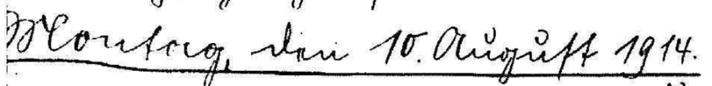 Als ich morgens in die Kaserne kam, stand die Kompagnie abmarschbereit zur Geländeübung auf dem Heller. Unter den eifrigsten Vorbereitungen für unseren Ausmarsch verging der Tag sehr rasch. Wir erhalten jetzt gutes Essen, in den Küchen kocht Landwehr vom immobilen Ersatzbatt 100 und zwar besser wie die aktiven Köche. Im westl. Flügel sind die ehemaligen Reviere der 9. und 10. Kompagnie vom Bekleidungsamt mit den zahlreich eingetroffenen Ökonomiehandwerkern belegt. Nachmittags haben die Mannschaften der Kompagnie Unterricht. Abends mußten alle Leute in der Kaserne, schlafen. Ich ging nach Hause, brauchte ich doch früh nicht mit ausrücken.
