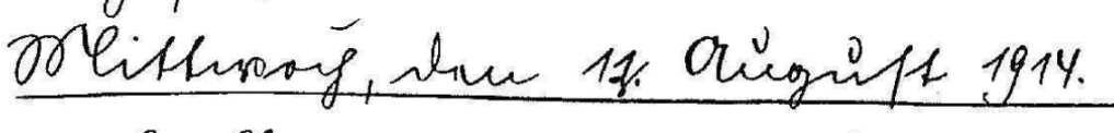 freiten, Utff Neumann, welcher als Kompagnieoffizier zum Ers. Batt, designiert ist. Nachdem wir gestern die erste Kriegslöhnung für 1.-10. August in Höhe von 450 M erhalten hatten, erhielten, wir heute schon wieder Löhnung auf die Zeit vom 11.-20. August mit 2.- Der Rest von 3.50 M wurde mit der schon früher erhaltenen Friedenslöhnung für 1.-10. Aug. ausgeglichen. Die Kriegsbeträge der monatlichen Löhnung betragen