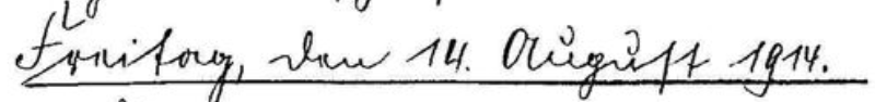 Der Tag verläuft, unter der fieberhaftesten Tätigkeit. Wir stellten die Kriegsstammrolle fertig und ließen die Soldbücher unterschreiben und abstempeln, denn die Gerüchte von einem baldigen Ausmarsch unseres Bataillons, wurden immer bestimmter. Nach Aussage meines Freundes Wolf, war aber bei der Brigade, davon noch nichts bekannt. Als es nun gar noch bekannt wurde, daß bei der 3. Kompagnie ein Leutnant auf 2 Tage ab morgen beurlaubt sei, waren wir alle der Überzeugung den Sonntag noch in Dresden zu verbringen. Abends schlafe ich in der Kaserne im Schlafsaale der 2. Komp.
