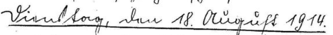 Die Ortsausgänge wurden mit Wachen gegen den Feind besetzt. Als wir gegen Abend zur Dienstausgabe angetreten waren, überflogen 2 Flieger unseren Ort. Als sich plötzlich etwas vom Apparat loslöste, glaubten wir es seien feindl. Bombenwerfer, doch waren es nur die Erkennungssignale eigener Flieger. Nach Eintritt der Dunkelheit beleuchteten die Scheinwerfer von Strasburg den schwarzen Horizont, um etwa nahende feindl. Flugzeuge und Luftschiffe rechtzeitig zu erkennen. Es war ein schauerliches Bild.