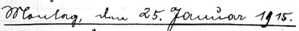 Unser Feldwebel war mit dem neuen Unterkommen, welches nicht so gemütlich war, wie das letzte, unzufrieden und hatte die schlechteste Laune, wobei es auch gelegentliche Zusammenstösse gab. Vor unserem Fenster sahen, wir immer schmutzige Weiber und Kinder, welche dieses Viertel bewohnten. Sie ärgerten unseren Feldwebel, einen ausgesprochenen Weiberfeind, immer mehr. Nachmittags verlangt der Hauptmann plötzlich die Kassenbücher, die ich glücklicherweise gestern vollständig nachgetragen hatte. Er sah diese das erstemal, war mit ihrer Führung zufrieden und wollte am 1. 2. 15 die Kasse revidieren.