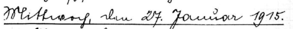 Kaiser’s Geburtstag! In der vergangenen Nacht war nach starkem Schneefall Frost eingetreten. Es war ein prachtvoller Wintertag. Um 10 hielt der Komp. Führer eine Ansprache, an deren Schluß er ein dreifaches Hurra ausbrachte. Der Tag blieb bis auf die Sicherungen Dienstfrei. Gegen Mittag kreiste in ganz geringer Höhe, ein Flieger über uns. Am Nachmittag kam eine Meldung, wonach le bois de la tour von feindl. Abteilungen besetzt sein sollte. Daher wurde die Aufmerksamkeit erhöht und am Abend die 4. Komp. zur Aufklärung vergesandt. Unser 2 Zug unter Offiz. Stellv.