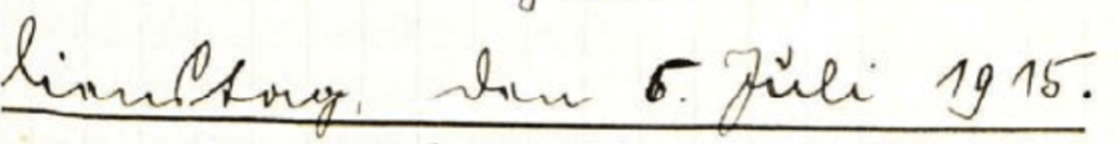 Prächtiges Wetter. Lebhafte Tätigkeit der Artillerien kennzeichnet den Tag. Am Abend kommen die gewohnten Flieger, welche heftig aber leider ohne Erfolg beschossen werden. Es gibt natürlich viel Arbeit. Frau Stenzel verlangt jetzt noch den Trauring ihres am 29.8.14 gefallenen Mannes. Mit dem Fleisch ist’s heute sehr knapp wegen betrügerischer Lieferung der betr. Firma. In einer Konservenbüchse, welche 12 ½ Pfund