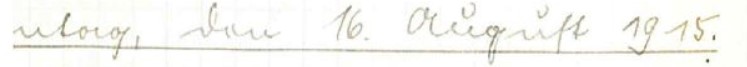 Heute am Jahrestage unseres Ausmarsches aus der Garnison liegen wir noch im Feld, wer hätte, das damals gedacht? Mancher deutsche Sieg wurde inzwischen errungen, doch auch mancher gab sein Leben. Wie lange wird’s noch Dauern? Hoffnungsvoll blicken wir in die Zukunft. Vielleicht komme ich morgen nach Jahresfrist, wieder einmal in einen Zug, um auf Urlaub zu fahren. Vorm Batt.- Quartier ist schönes Konzert , sodaß man sich in Feiertagsstimmung versetzt fühlt. Ich habe viel Arbeit um, alles auf, und vorzuarbeiten ehe ich dem Dienst den Rücken kehre.