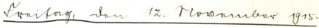 Der Jahrestag einer heftigen Beschießung von Cirey, welcher uns 2 Verwundete kostete. Rupf, der damals verwundet wurde, verläßt heute mit Ltnt. Wagner abermals die Kompagnie. Letzterer kommt zu den Fliegern wohin er sich freiwillig gemeldet hat. An seiner Stelle ist Ltnt. Brose Batl. Adjudant geworden. Der Feldwebel bleibt den ganzen Tag im Bett. Das schlechte Wetter hält an. Viele Kameraden hätten an die Mär vom Frieden am 11.11.15 geglaubt und machen nun ihrer Enttäuschung durch kräftiges Schimpfen auf den langen Krieg Luft.