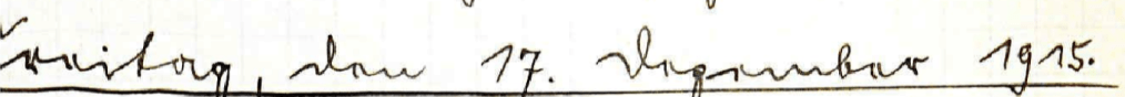 Am Morgen kommt der Feldwebel aus Val zurück. Im Gelände heute furchtbares Artilleriegetose. Vizewachtmeister Keiler, von der Ers. Abtlg. 28 erhält das Eis. Kreuz I. Klasse. Er hat einen franz. Maschinengewehrstand mit Dynamit gesprengt und saß beim Schießen der Artillerie immer auf einem Baum in unserer Komp.-Stellung,