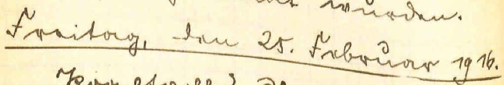 Die Kanonade in der Ferne verstummt auch heute nicht. Der Heeresbericht verkündet, daß sich die Gefangenenzahl nördlich Verdun auf 10000 erhöhte. 6 befestigte Orte wurden genommen. Nachmittags schossen die Franzosen auf unsere Höhe, sodaß die Splitter der Granaten in der Nachbarschaft herumflogen, abens nochmal etwas weiter. Wir suchten im Schützengraben der 2. Stellung Schutz. Die Franzosen suchen die Geschütze bei der Vala- Mühle. Feldw. Winkler war zum Glück in Val.
