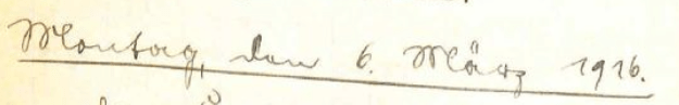 Die Kompagnie löst vormittags in der Stellung ab. Sie ist natürlich ohne Ausnahmen froh, daß diese „Ruhezeit“ vorüber ist. Der Feldwebel wird ins Batl. bestellt, wo eingehende Belehrungen stattfinden. Man rechnet nach verschiedenen Redensarten mit französischem Trommelfeuer. Diese Annahme wird dadurch bestätigt daß eine schnelle Granatsichere Überdachung aller Unterstände angeordnet, und ohne Rücksicht auf die Mannschaften durchgeführt wird. Angeblich wird auch ein Gasangriff befürchtet, welcher aber in unserem Gelände nicht möglich erscheint. Man will aber die Absicht trotzdem durch Abhören feindl. Ferngespräche festgestellt haben. Gegen Mittag macht Herr Ltnt Blass und 1 Gruppe der Komp. sowie der Feldwebel nach Cirey, wo Gefr. Bischoff 1/2 7o beerdigt wird. Mit Freude empfangen wir die Nachricht von der glücklichen Heimkehr der „Möwe“ mit reicher Beute, vor allem 1 Million in Gold. Ein Unterhaltungsskätchen mit Burger und Knorr beschließt den Tag.