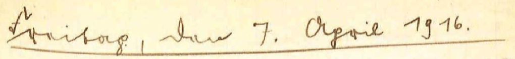Trockenes, schönes Wetter! Ruhe im Gelände. Ich schreibe nach Hause und bitte, es mit einem Gesuch zu versuchen, damit ich zur goldenen Hochzeit Urlaub erhalte. Engel Arthur teilt mir mit, daß am 26.3. unser Schulfreund Rudolf Seliger, genannt Sepp, gefallen ist. Es ist schade um seinen nie versagenden Humor. Ich gebe meine Wintersachen (Leibbinde, Kopfschützer, Handschuhe, Pulswärmer) ab, hoffentlich um sie nicht noch einmal fassen zu müssen. Die Zeitung bringt uns am Abend Kenntnis von der am 5.4.16 gehaltenen Reichskanzlerrede hoffentlich entschließen sich unsere Gegner auf Grund der darin erörterten Friedensgedanken Friedensvorschläge zu machen. Nach langer Zeit schreibt mir Borth’s Karl wiedereinmal und schickt eine Photographie, worüber ich mich wie über alle Erinnerungen an alte, schönere Zeiten sehr freute. Hoffentlich ist die Stunde nicht mehr fern, wo wir uns in friedlicher Heimat wiedersehen können.