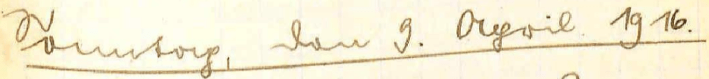 Die Komp. ist in Reserve was sich am bedeutend erhöhten Betrieb bei uns zeigt. Es ist schönes Wetter am Morgen ein leichter Sprühregen. In den Stellungen herrscht völlige Ruhe. Man hört nur ab und zu die Gewehrbatterie und einige Geschütze die Ruhe unterbrechen. Abends bin ich allein. Der Feldw. hält Dienstausgabe und Burger nimnt