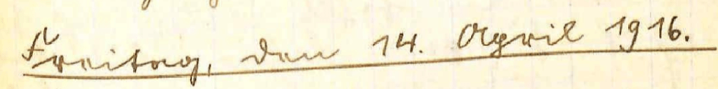 Feldwebel macht nach Val. Greger [??] , Vergander [??] und Eulenburger werden zu Gefreiten ernannt. Nach den allgemein im Umlauf befindlichen Gerüchten soll die 84. Lw. Brig. vorgehen, dabei auch der linke Div.-Flügel, also unsere Kompagnie. Abends beschoßen die Franzosen wieder wie gestern den Abschnitt des II. Batl. furchtbar mit Artillerie. Es scheint fast als o sie auch etwas vor haben. Ein Skätchen beschließt den Tag.