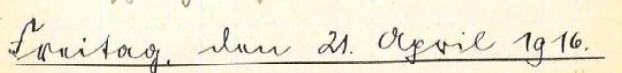 Karfreitag! Der zweite unter der Herrschaft des Krieges. Früh kommt der Feldwebel von Saarburg zurück. Wir sind sehr zeitig aufgestanden und haben bereits Feuerholz gesägt und gehackt als er kommt. Es ist etwas besseres Wetter. Mittags gehe ich mit dem Feldwebel in die Stellung, wo wir die Löhnung auszahlen. Man sieht die frischen Erdhaufen an der Stellen, wo die zahlreichen heraus geführten Minenwerfer aufgestellt wurden. Artelleriebeobachter sind recht zahlreich. Rubo [??] schießt sich ein. Auf der